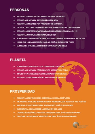 El panel de expertos ha revisado toda esta investigación y considera que los siguientes 19 objetivos representan la mejor relación calidad-precio en desarrollo durante el período 2016 a 2030. Los objetivos se han agrupado en tres grandes temas: las personas, el planeta y la prosperidad haciéndose eco en el foco de la ONU sobre los pilares sociales, ambientales y económicos del desarrollo. El panel reconoce que la eliminación de la pobreza extrema sigue siendo una importante aspiración central para toda la agenda post-2015. Muchos de los objetivos de abajo contribuirían a lograr reducciones en la pobreza, tales como el mayor libre comercio, la educación de niños en edad preescolar en África, la nutrición y la garantía de una mayor igualdad de género para las mujeres.