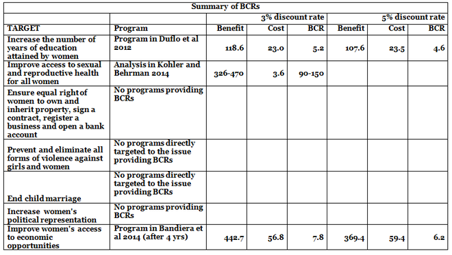 Education can have effects on labor force participation, health, child care, prevent early marriage and maybe even reduce violence against women, but for the post-2015 targets more dimensions of gender equality should be considered. The HLP proposals include four objectives to empower girls and women and achieve gender equality, which are considered below. When estimating benefit-cost ratios, we have to be aware that they can vary between countries and that both positive and negative externalities can have an impact. Another potential drawback of the use of economic analysis in the area of human rights is the ethical implications of quantifying issues such as women’s lives or wellbeing.