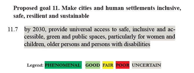 RATING: UNCERTAIN: the issues highlighted in this target – namely safety and inclusion are considered in broader circumstances in other targets, 16.1, 10.2, both of which are rated UNCERTAIN. The idea of accessibility is important, it can be a complex exercise to retrofit cities for disability access. Depending on the development of the city, there may be other, more beneficial investments that would provide benefits for the disabled, other minority groups and the general population (e.g. improving disaster resilience). The question of improving disability access should be made on a city-by-city basis.