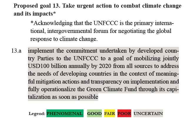 RATING: This target is rated as UNCERTAIN. Currently, LDCs are struggling with the general mechanisms of how the UNGCF would operate. Without clarifying how the fund will function at a practical level (e.g. managing LDC concerns such as geographical concentrations) and without the $100 billion of funding in place, the risk of operationalizing the UN GCF quickly could be an expensive and ineffective undertaking. At this time, the benefits of achieving the goal as stated are not well known. If the fund is used to promote R&D then rating would be PHENOMENAL. If the fund is used to rollout projects with inappropriate technologies then the rating would be POOR.