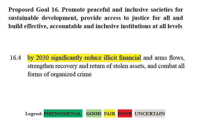 For the illicit financial flows component, better wording for this target is below from Cobham (2014), which focuses on key transparency mechanisms nations could adopt to reduce IFF. Given the uncertain but likely large sums of IFF involved, and the low cost of these policies these would have a rating of at least FAIR, but potentially PHENOMENAL.