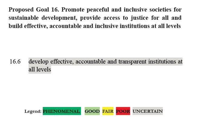 RATING: UNCERTAIN These are important broad goals and values, but as targets are too general, and unrealistic. Identifying more specific targets and indicators that are meaningful, measurable, and realistic is the challenge. It may be possible to a limited extent, especially for effectiveness and transparency.
