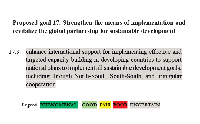 RATING: UNCERTAIN – The Sustainable Development Goals within this document have been rated from PHENOMENAL to POOR, so there is large variance in the benefits and cost profiles of the targets. Attaching a BCR rating to capacity building to implement the SDGs depends on which SDGS are given prominence in implementation. Clearly, a focus on PHENOMENAL or GOOD targets, would lead to a high BCR while a focus on POOR or UNCERTAIN targets would lead to a low BCR. However, target 17.6 suggests that cooperation and knowledge transfer between countries, in a general sense, has very high benefits and low costs.