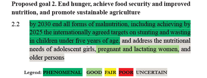 RATING: PHENOMENAL for targets related to children under 5. There is robust evidence that reducing stunting leads to lifetime of ongoing benefits, at very little cost (Hoddinott et al, 2012). Complete elimination of malnutrition by 2030 is optimistic.