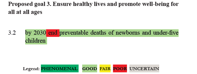 RATING: It is very unrealistic to expect an end to preventable new-born, and under-five deaths in wealthy, developed nations, let alone lower and middle income countries by 2030. With realistic targets for reduction in child and newborn death rates (say 20 per 1,000 live births as recommended by CIH), the rating is GOOD. For children between 1-59 months, interventions are relatively cheap (e.g. basic health, vaccines, micronutrients) and have lifetime benefits. For neo-natal infants (less than 1 month), the rate of decline in deaths can continue in low and middle-income countries with relatively inexpensive interventions. However, at some point sustained reduction in neo-natal mortality rates will only occur with costly intensive care facilities.