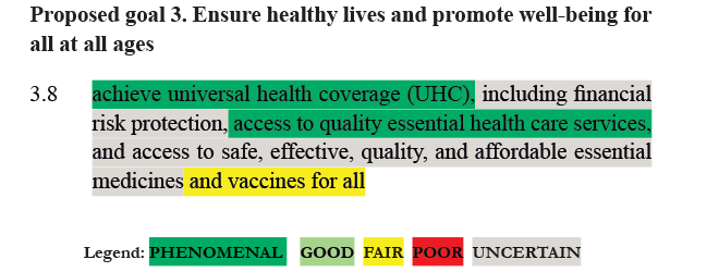 RATING: For UHC the rating is PHENOMENAL, assuming a gradual increase in coverage over time, focusing first on diseases where interventions have high benefits-to-costs. For financial risk protection the rating is UNCERTAIN. For affordable essential medicines, since much depends on what is meant by “affordable” and “essential”, the rating is UNCERTAIN. The cost structure of vaccines is typically cheaper with known benefits. The rating for these is therefore, GOOD.