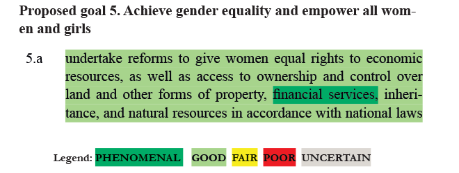 RATING: GOOD. This goal is linked strongly to general development; the first step is to ensure women have opportunities to access assets and therefore gain income.