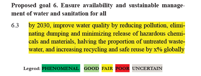 RATING: FAIR – but depends on the interventions taken to improve ‘water quality’. If it means installing capital-intensive secondary treatment facilities across the globe, then this is very unlikely to occur by 2030. However, there are localized, cheaper interventions that can be implemented to improve water quality such as filters. Reducing pollution is an ambitious goal, but the focus on dumping of toxic materials is sensible, since there are stronger incentives to remove toxicity versus less harmful (but still harmful) pollution.