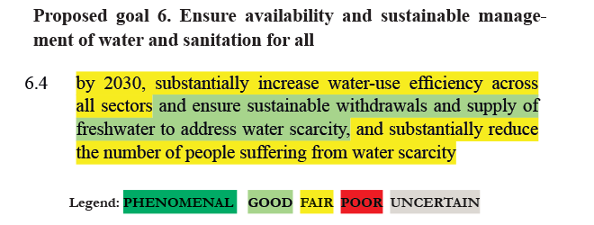 The likely impediment to the achievement of this target is changing the behavior of water users, which presents unique challenges. Governments around the world have set water-use efficiency targets, typically with mixed success e.g. California’s 20% by 2020. On the other hand, increasing demographic and environmental pressures (such as climate change) may compel actors to improve water use efficiency.
