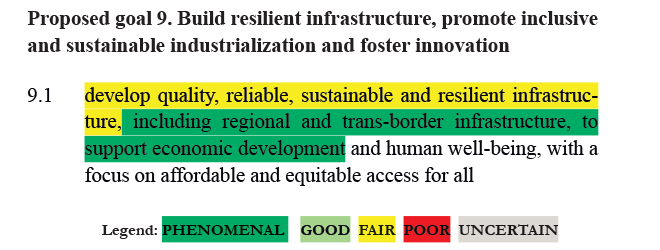RATING: The rating depends on the nature of the infrastructure. Energy infrastructure has PHENOMENAL rating, water infrastructure has a FAIR rating, transport infrastructure has a FAIR rating. Regional and trans-border infrastructure that supports trade has a PHENOMENAL rating.