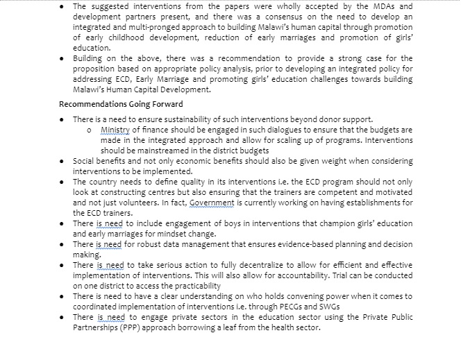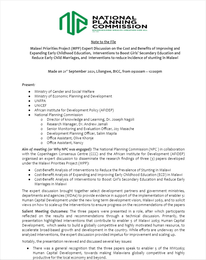 The initial findings of the analysis on Child Marriage were presented to the Malawi Protection Cluster at a Research Webinar on April 12, 2021. The discussion generated at the webinar led to more nuanced and improved accuracy of the findings, in addition to opening the discussion on the use of cost-benefit analysis in making the case for internvetions surrounding Child Marriage and Girls Secondary Education. The findings of the Technical Report were later presented at a Media Panel hosted by the NPC, which focused on comparing the efficiency of different Early Childhood and Girls’ Schooling interventions for Human Resource Capital and Health outcomes. The NPC later hosted a Workshop on Interventions focused on Early Childhood Development and Early Child Marriage in September 2021. The workshop focused on defining how ECD and ECM are linked to human capital which lines up very well with the Vision 2063. The workshop brought together the three ministries which need to start working together in an integrated fashion as a whole-cycle approach on these issues (Gender, Education, Health). There is a need for a paper to determine the linkage between ECD and ECM, to act as a foundation for a more integrated policy and programmatic approach. The findings were also used to inform discussion at the National Symposium on Ending Child Marriage, held from Nov. 9-12, 2021.