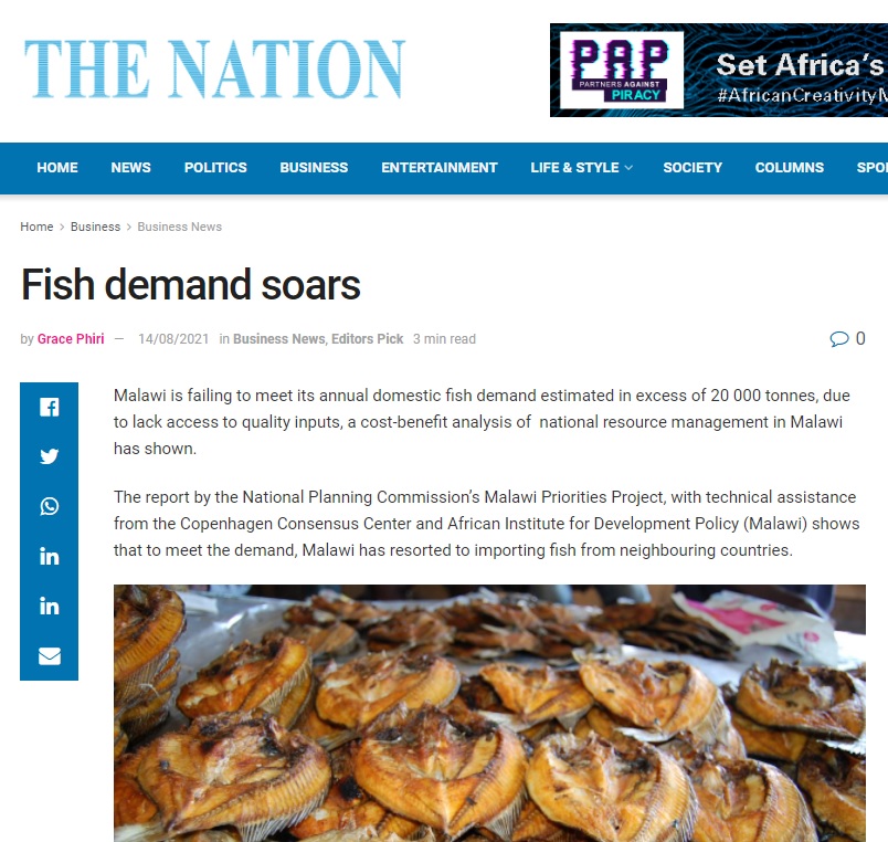 The Technical Report and Policy Brief for Fisheries and Oceans was approved by the National Planning Commission in July 2020. The findings were uploaded to the NPC’s website, AFIDEP’s website, and the website of the Copenhagen Consensus. All three organizations have promoted the launch of the report across various social media platforms, including twitter and LinkedIn. Additional dissemination activities are planned for 2022, in order to ensure the policy-making environment is not over-saturated with Malawi Priorities products in 2021.