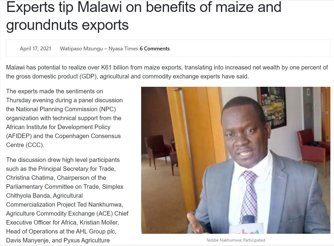 On a public scale, the findings of the Technical Report were introduced within a series of Op-Eds produced by the NPC within the Daily Times and the Nations Newspaper. The OpEd outlining the findings ran on March 23, 2021. On March 31, 2021, the Government of Malawi announced a temporary lifting of the Maize Export Ban - a key recommendation of the report. Subsequently, on April 15, 2021, the NPC hosted a Media Panel on Encouraging Agricultural Exports in Malawi. Panelists included the Hon. Simplex Chithyola, Chairperson of the Parliamentary Committee on Trade, and Christina Chatima, Principal Secretary for the Ministry of Trade. The Panel received wide coverage by the Media, with more than three newspapers discussing the findings within the coming week.