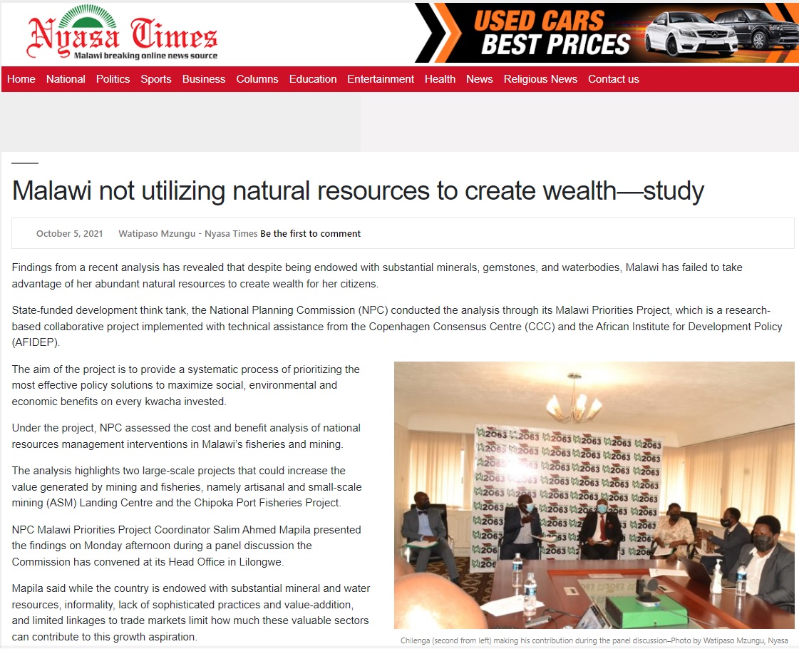 On October 4, 2021, the NPC Malawi hosted a Media Panel to promote the findings of the Malawi Priorities Technical Report on National Resource Management and received higher than average media coverage. This Media Panel was featured predominantly on major TV networks such as the Malawi Broadcasting Corporation, Times Television and print media like Nyasa times and Daily times.