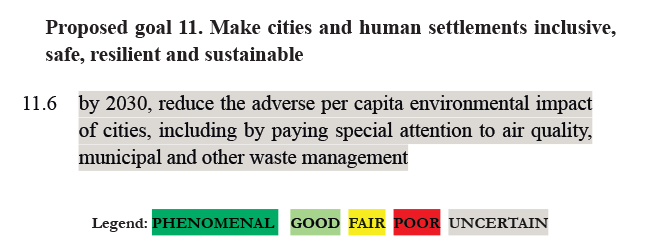 RATING: UNCERTAIN – developing indicators for this target will be difficult. Additionally, it is important that this target does not unnecessarily shrink urbanization (and the benefits associated with high density living). For example, it is likely to be preferable, from an environmental standpoint, for many people to live in a high-density apartment than for the equivalent amount of people to be spread out in a low density suburban housing – though the former may appear less ‘environmental’. That said, in selected urban environments, such as cities in China, introducing congestion taxes for cars will have very high payoffs in terms of air quality and congestion at relatively low cost with benefits in the PHENOMENAL range.