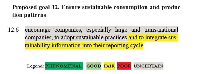 RATING: UNCERTAIN for adopting sustainable practices. The term is general, and experience shows that the impact of corporate social and environmental responsibility programs enacted by companies is highly variable. For reporting, the cost-benefit ratio is FAIR – the costs are unlikely to be very high, particularly for large companies that are already reporting financial information – though it will depend on the regulatory burden. A strong argument in favor of this target is that it would generate increased transparency, particularly in countries with low levels of corporate reporting - which could yield large, but uncertain benefits.