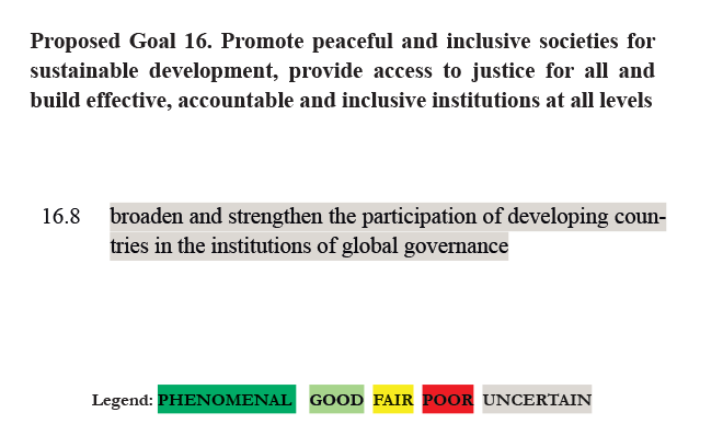 RATING: UNCERTAIN. Increasing the participation of developing countries in international institutions may increase the legitimacy of those institutions – or broaden their legitimacy – but whether it would lead to better governance is less clear. This target is very similar to target 10.6.