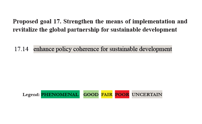 RATING: UNCERTAIN – in general policy coherence is a GOOD objective as it reduces unnecessary effort, and is relatively inexpensive to implement (assuming political objectives are aligned between actors). However, as stated in 17.9, the BCR rating depends on which sustainable development goals are given prominence in implementation.