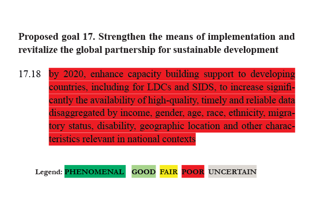RATING: POOR – Providing this type of data requires significant strengthening of statistical capacity in developing countries i.e. personnel and technical assistance, which represents a non-trivial cost, especially for certain countries where ability to collect is poor. Jerven (2014) shows that the costs of measuring a sustainable development agenda, in the manner envisaged by the data revolution, are in the order of $1Bn USD per target, globally. There is a strong risk that pressing developing countries for more data, specifically for a sustainable development agenda, will mean the transfer of resources away from data collecting activities required for national contexts.