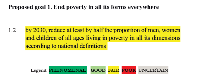 Better wording: By 2030, reduce by at least 50% the proportion of people living below national poverty lines “based on standardized, internationally consistent methodology to construct poverty lines”