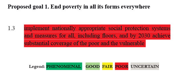 RATING: POOR. The introduction of a social protection floor, while laudable, is difficult to achieve well (properly targeted at low cost). Additionally, the resources required to implement full social protection are large and it risks creating very large (even 100%) effective marginal tax rates for the poor with disincentives to increase income. Moreover, the emerging evidence from studies that account for the full, general equilibrium effects of social protection and cash transfer programs is that unintended consequences can harm non-target groups either because local prices are raised (Lehmann, 2013) or because of the distortion in employment choices with expanded social protection leading to more informal employment (Camacho et al, 2013).