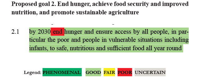 RATING: The ambition to end hunger by 2030 is unrealistic. This is a GOOD target if it is directed at a subset of the population who could be reached but are currently lacking sufficient calorific and micronutrient intake.