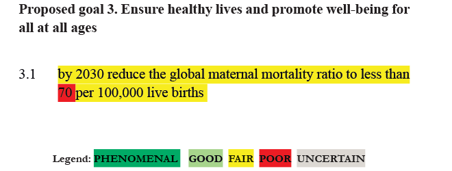 RATING: As written this is an unrealistic target. The Commission for Investing in Health, 2013 (CIH) recommends a target of 94 maternal deaths per 100,000 live births by 2030 as a realistic, but ambitious stretch target for MMR. With more realistic targets for MMR this target would be rated FAIR. It is relatively cost-effective to reduce MMR in lower income countries through spread of basic health interventions. To reduce MMR beyond this requires more costly interventions such as improved health facilities and registered attendants at birth.