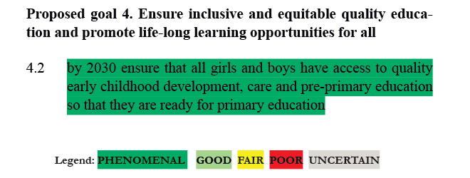 Rating: PHENOMENAL, though depends on realistic stretch target that represents an improvement over present conditions in a given country or setting. Most evidence including that of Nobel laureate Heckman, shows that the benefits of acting early are very large, with relatively lower costs. Most of this evidence is from US studies, though there is little reason to believe that it would not also be the case in developing countries.