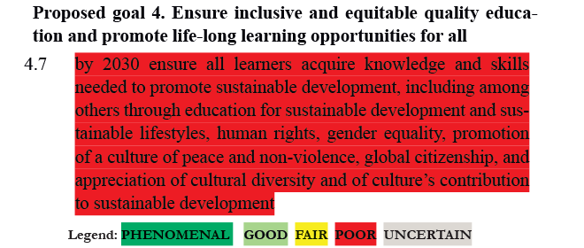 RATING: POOR – First of all, the target contains too many diverse components each deserving a separate treatment and rating. Second, many of the components are nice-sounding keywords that are difficult to define: For example, what is “culture of peace and non-violence”? What exactly is a “culture of sustainable development”? If these are not defined well then the target risks being ineffective.